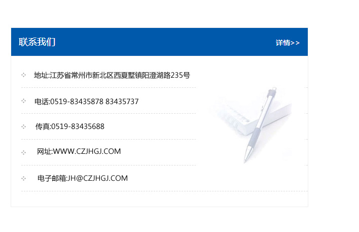 地址:常州市新北區友邦商務大廈1幢16、17層  電話:0519-85101652  傳真:0519-85112595  郵編:213022  網址:www.cz-jiayue_cn.hexingkeji.com  郵箱:xiajifengaa@163.com